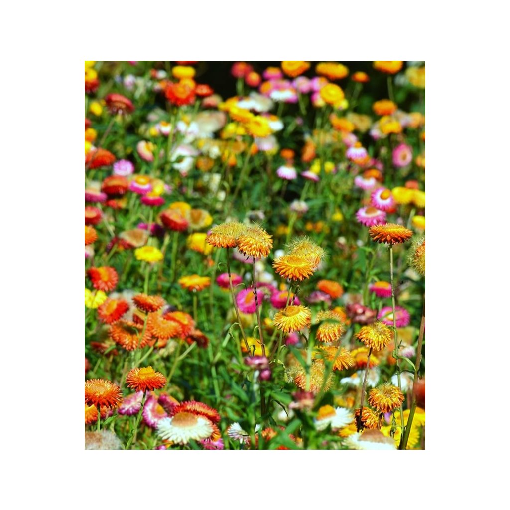 Nízká odrůda tradiční slaměnky s rostlinami ve směsi barev. Vhodná na letničkové záhony i k sušení samostatných květů.